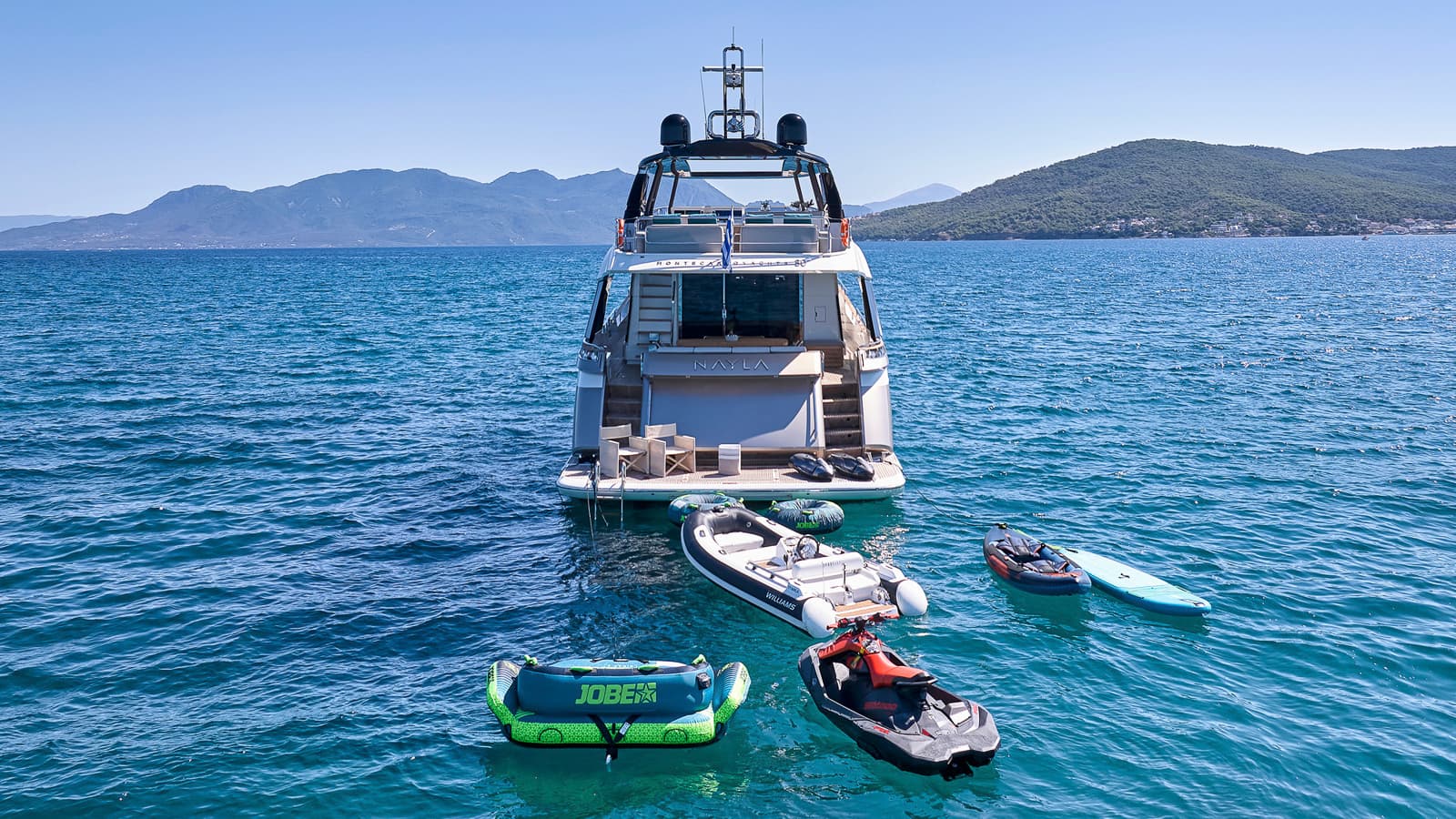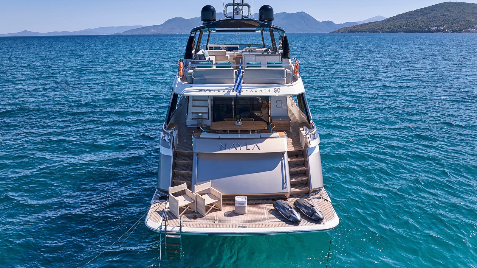 Delivered in 2018, NAYLA is a 24.6m Monte Carlo Yacht offering contemporary Italian design paired with outstanding comfort and performance. She welcomes nine guests in four beautifully appointed cabins, including a full-beam master and versatile twin layouts. Spacious outdoor areas feature a best-in-class flybridge and an innovative foredeck lounge for relaxed dining. Stabilizers at anchor and underway, a hydraulic swim platform, and an impressive toy collection ensure effortless enjoyment, supported by a professional and attentive crew.